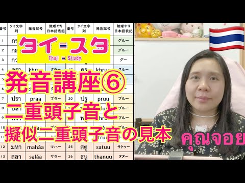 - 40番以降は表記しているタイ語をタイ人に読んでもらっても違う読み方をする可能性があります。これらは発音練習のために、実在するタイ語ではない物も入っており、これを二重頭子音字とは判定せず、子音1文字目は頭子音字として、最後の子音を末子音と判別して読む可能性があるためです。タイ人には二重頭子音字、つまりพยัญชนะประสม (phayanchanáʔ prasǒm)の発音練習ฝึกออกเสียง (fɯ̀k ʔɔ̀ɔksǐaŋ)だと言おく必要があります。